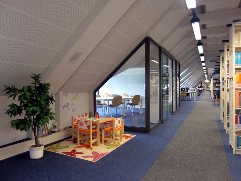 Für Kinder, die ihre Eltern in die Bibliothek begleiten, lädt die Kinderecke im Lesesaal der 4. Etage (hinter den Bücherboxen) mit Spieltisch, Sitzkissen, Malsachen und Kinderbüchern zum Verweilen ein.