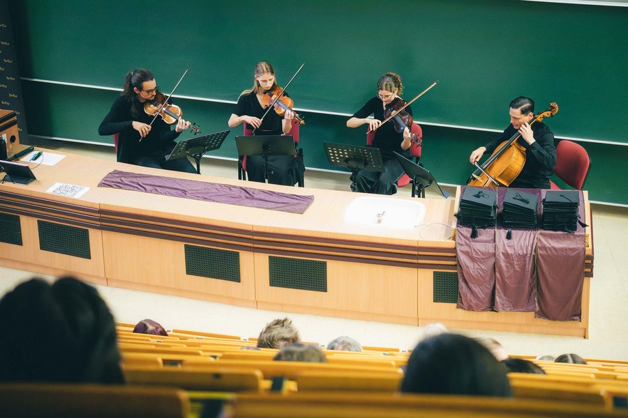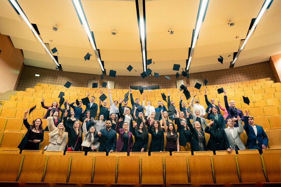 The ceremony was musically framed by a quartet of students from the Instrumental and Vocal Performance and Teaching study programme. There were also great speeches from the student body by Gina Göritz and Saharnaz Hashemifrom Biotechnology and Biotechnology respectively. A special highlight was the ceremonial handover of the graduation hats and the traditional joint hat toss, which made for many smiling faces. At the subsequent champagne reception and the atmospheric snowflake ball, the successful final degree was duly celebrated and offered space for exchange, souvenir photos and a look into the future.