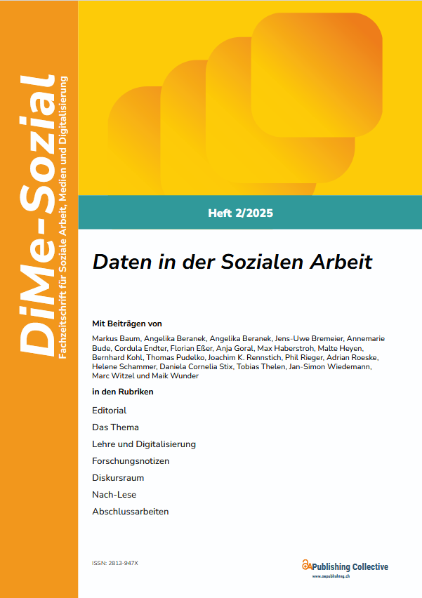 Teaser: Obwohl in der Sozialen Arbeit seit jeher große Mengen an Daten erhoben, verarbeitet und ausgewertet werden, sind Daten in der Sozialen Arbeit bisher nicht breit thematisiert worden. Vielen in der Sozialen Arbeit Tätigen ist selten bewusst, dass sie regelmäßig mit umfangreichen Datenmengen umgehen und diese verarbeiten. Da dieser Bereich oft „nebenbei“ erledigt wird und bislang nicht im Zentrum der sozialarbeiterischen Prozesse steht, wird diese Ausgabe von DiMe-Sozial Beiträgen Raum geben, die sich mit dem Themenkomplex digitaler Daten in der Sozialen Arbeit beschäftigen.
