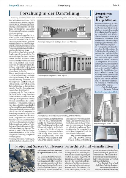 Vom 24. bis 26. September 2009 fand die vom Lehrstuhl Darstellungslehre, Prof. Dominik Lengyel, organisierte internationale Konferenz zum Thema "Projecting Spaces" an der BTU statt. Aus zehn Ländern gaben zweiundzwanzig Vorträge einen Überblick zum aktuellen Stand der Darstellung in der Architektur.