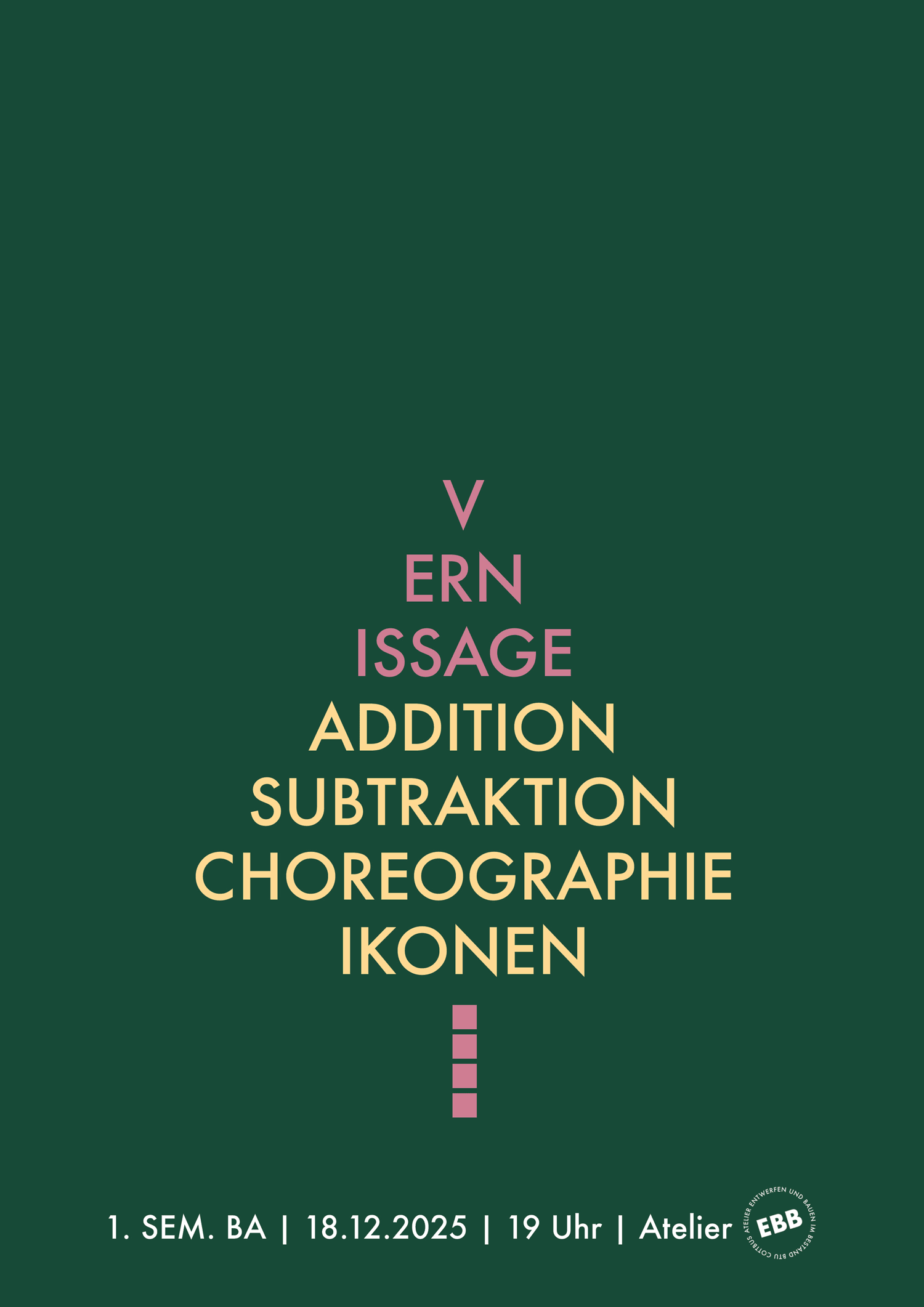 Es erwartet Euch/Sie eine Ausstellung der Bachelorstudenten des 2. Semesters des Atelier Pedersen.