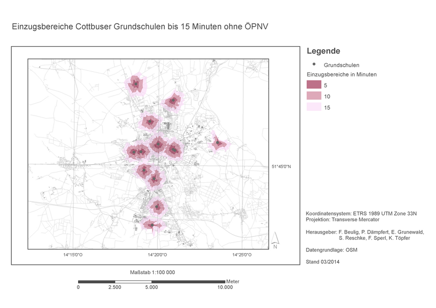 Im Rahmen der Lehrveranstaltung "GIS in der Stadt- und Regionalplanung" im WS 2013/14 wurde die Erreichbarkeit der staatlichen Cottbuser Grundschulen untersucht.