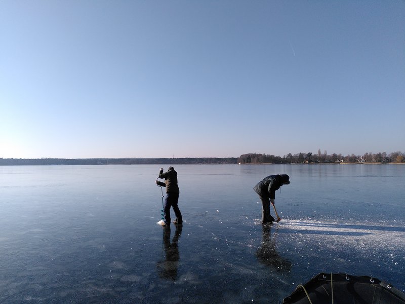 Dann eben mit entsprechender Ausrüstung - Schlitten, Eisbohrer, Axt - auf bzw. durch das Eis! Natürlich immer mit entsprechenden Vorsichtsmaßnahmen und Kenntnis der jeweiligen Bedingungen. Bitte nicht nachmachen!