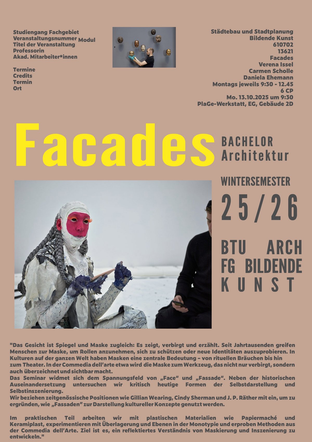 "Das Gesicht ist Spiegel und Maske zugleich: Es zeigt, verbirgt und erzählt. Seit Jahrtausenden greifen Menschen zur Maske, um Rollen anzunehmen, sich zu schützen oder neue Identitäten auszuprobieren. In Kulturen auf der ganzen Welt haben Masken eine zentrale Bedeutung – von rituellen Bräuchen bis hin zum Theater. In der Commedia dell’arte etwa wird die Maske zum Werkzeug, das nicht nur verbirgt, sondern auch überzeichnet und sichtbar macht. Das Seminar widmet sich dem Spannungsfeld von „Face“ und „Fassade“. Neben der historischen Auseinandersetzung untersuchen wir kritisch heutige Formen der Selbstdarstellung und Selbstinszenierung.