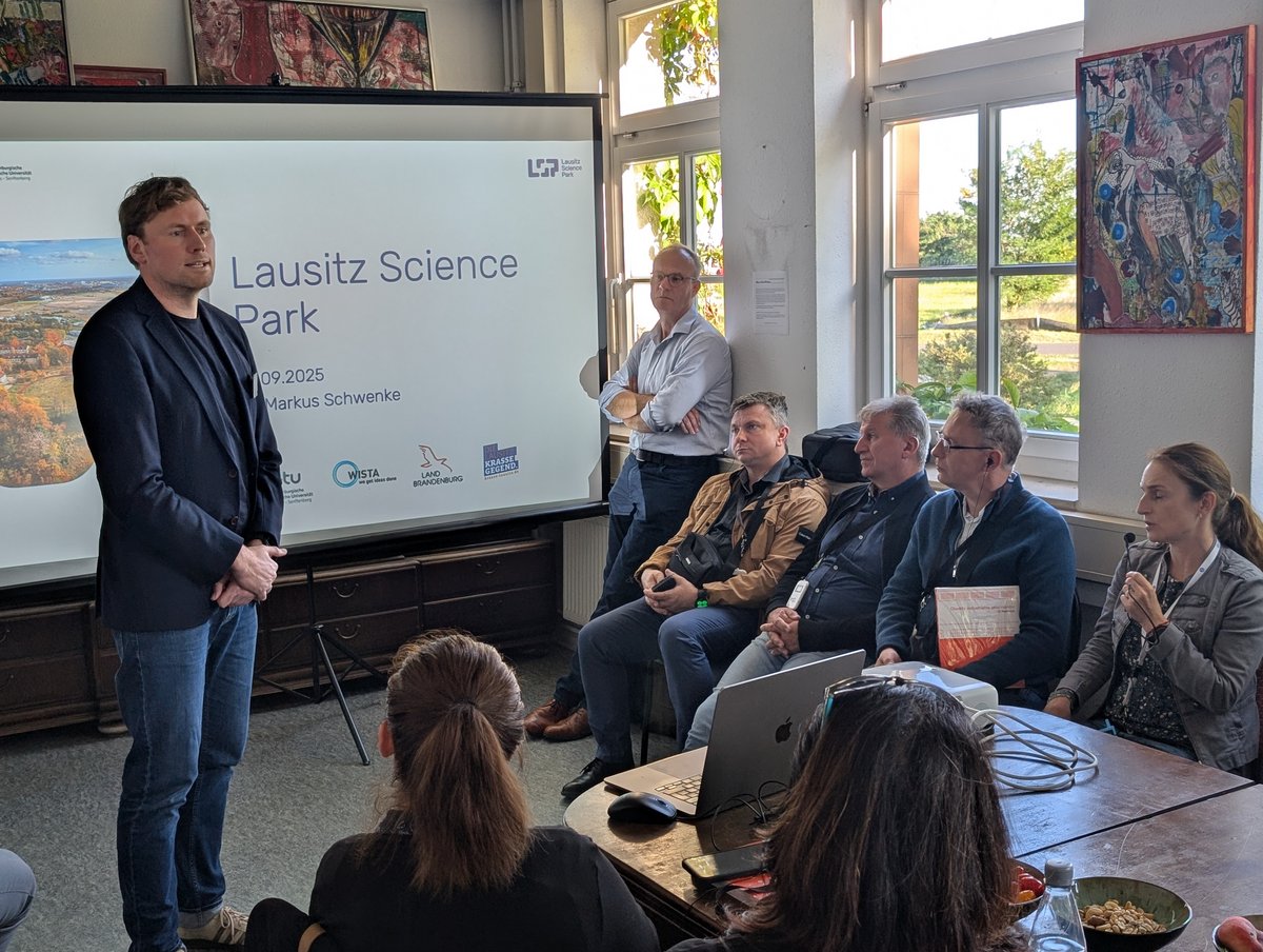 Im Rahmen der Tour "Transformation in der Lausitz" haben Vertreter*innen aus dem oberschlesischen Industrierevier Katowice am 24. September 2025 den Lausitz Science Park in Cottbus besucht. Dr. Markus Schwenke, Leiter des BTU-Projekts, und Dr. Lars Scharnholz vom Institut für Neue Industriekultur INIK GmbH erklärten den Besucherinnen und Besucher die Besonderheit dieses Ortes und wie er sich entwickeln soll.