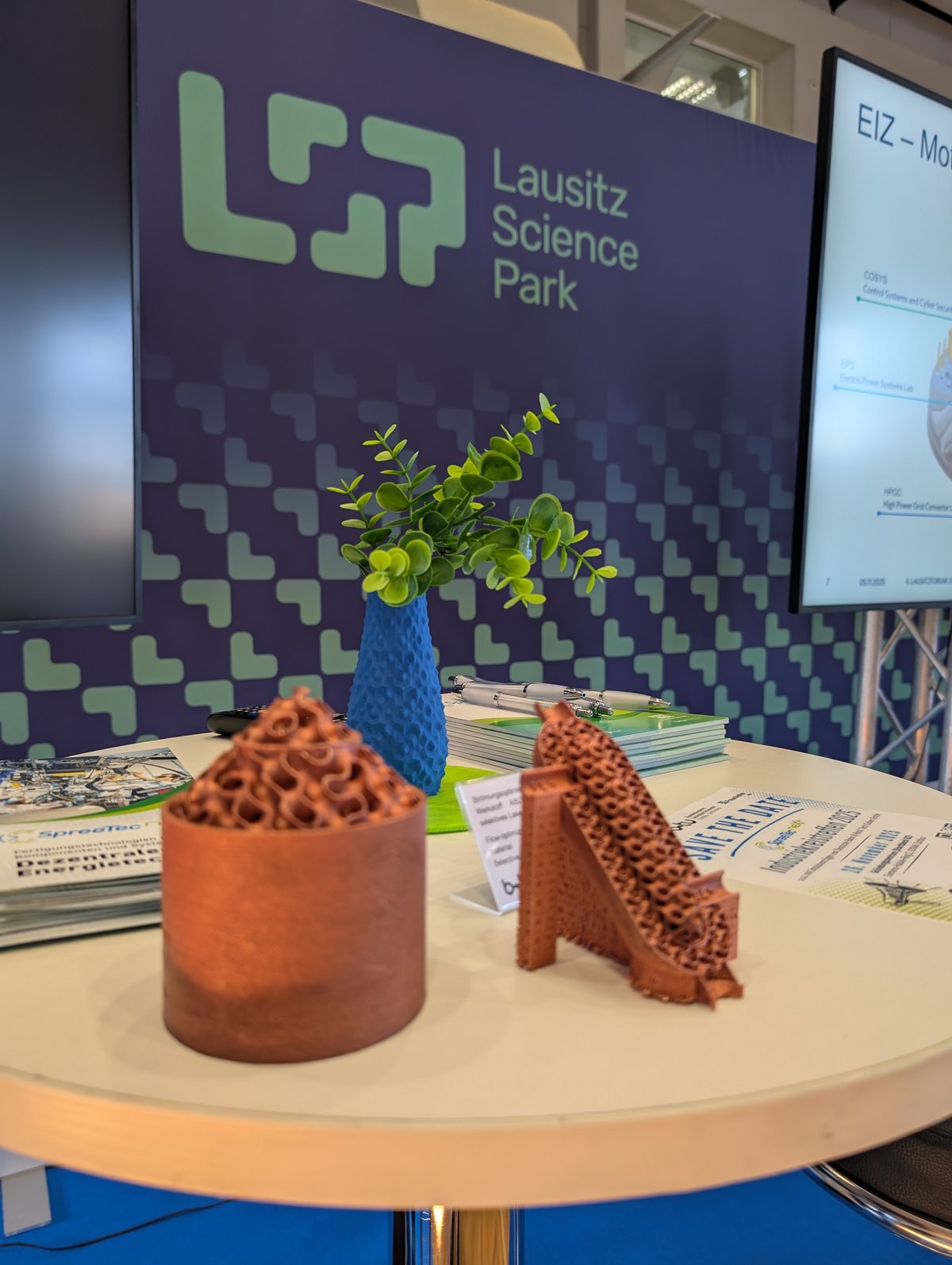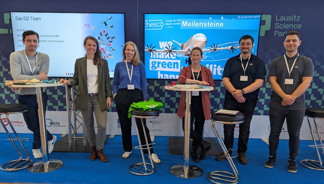 Unter dem Motto „Von hybridelektrischen Antriebssystemen bis zu nachhaltigen Industrieprozessen“ präsentierte der LSP gemeinsam mit seinen Partnern die ganze Bandbreite an Forschungs- und Innovationskraft, die in der Lausitz wächst. Am LSP-Gemeinschaftsstand präsentierten sich das Center for Hybrid Electric Systems Cottbus (chesco), das Energie-Innovationszentrum Cottbus (EIZ), SpreeTec neXt sowie das DLR-Institut für Elektrifizierte Luftfahrtantriebe und das DLR-Institut für CO₂-arme Industrieprozesse präsentierten. So kamen Besucher*innen mit den Vertreter:innen aus Forschung und Entwicklung direkt ins Gespräch und informierten sich über aktuelle Projekte.