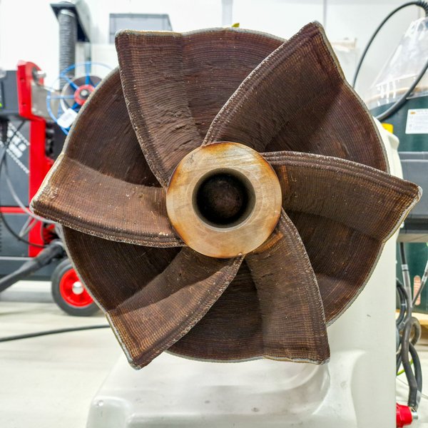 Das Fachgebiet LFT zeigt einen großformatigen Demonstrator aus dem Wire Arc Additive Manufacturing. Der Impeller mit 500 Millimetern Durchmesser, aufgebaut mit 316L-Edelstahl, veranschaulicht die Möglichkeiten des metallbasierten 3D-Drucks für energie- und verfahrenstechnische Anwendungen.