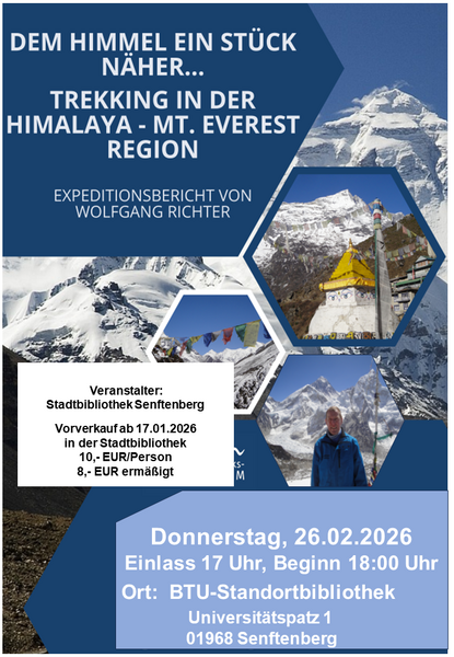 Nach kurzer Einstimmung mit nepalesischer Musik unter buddhistischen Gebetsfahnen nimmt Wolfgang Richter in seinem spannenden Expeditionsbericht die Gäste mit auf die legendäre Trekking-Route zum Everest-Base-Camp (5.380 m) und Khala Pattar (5.550 m), in eine der beeindruckendsten Bergwelten am riesigen Khumbu-Gletscher und unmittelbar am „Dach unserer Welt“: Mt. Everest, Lothse und Nuptse.