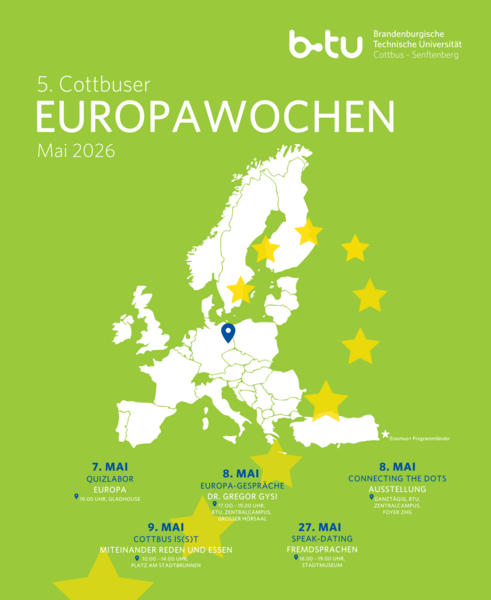 | 11. Mai 2026 15:30-17:30 Uhr | BTU Zentralcampus, Senatssaal | Simulationsspiel „European Parliament“ | offen für BTU-Studierende; Anmeldung bis zum 6. Mai über Christin Handrek (christin.handrek(at)b-tu.de) |