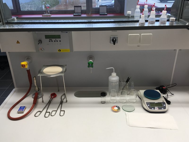 Bevor es losgehen kann, werden die Schüler mit Laborkittel und Schutzbrille ausgestattet. Nach einer kurzen Erinnerung an die Sicherheitsregeln im Chemielabor geht es dann an die Arbeitsplätze. Angepasst an Fertigkeiten der Schüler und Kenntnisse zum ausgewählten Thema werden die Schüler entweder bei der Durchführung der Experimente angeleitet oder führen diese anhand einer Versuchsvorschrift eigenständig durch. Auf Wunsch der Lehrkraft kann ein Protokoll angefertigt werden.