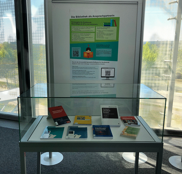 Außerdem erfuhren Sie, welche Unterstützung Sie durch die Universitätsbibliothek beim wissenschaftlichen Arbeiten erhalten: Ein Plakat informierte Sie über unser Kursprogramm und die richtigen Ansprechpersonen für Information und Beratung speziell für Ihr Fach.