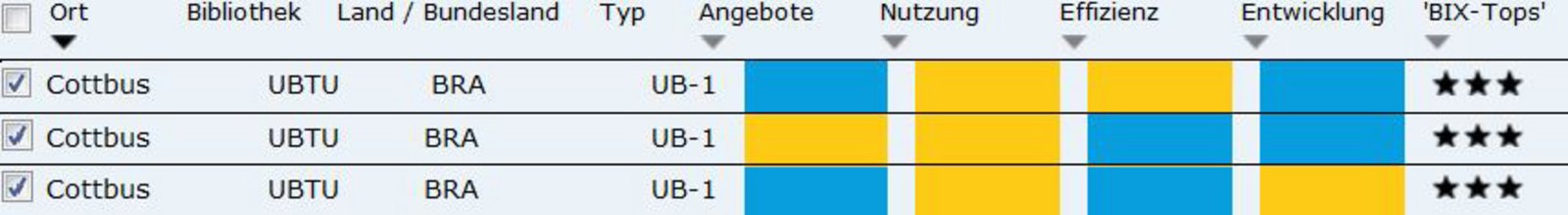 Dies wurde bis 2015 alljährlich im Bibliotheksindex BIX ermittelt. Dazu wurden für jede teilnehmende Bibliothek vier bis fünf ausgewählte Kennzahlen in den sogenannten "Zieldimensionen" Angebot, Nutzung, Effizienz und Entwicklung erhoben. Die UB Cottbus hatte sich von 2004 - 2014 am BIX beteiligt.