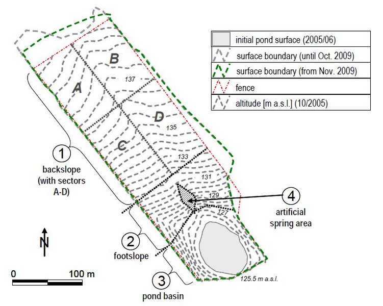 Das Gelände wurde vollständig eingezäunt, um Zerstörungen und Vandalismus vor allem durch menschliche Besucher, aber auch durch Wild zu vermeiden. Die Bauarbeiten wurden im September 2005 beendet, so dass dieses Datum als "Punkt Null" der nun ablaufenden Entwicklungen definiert werden kann. Seit diesem Zeitpunkt wurde die Fläche einer ungelenkten und nicht beeinflussten Sukzession überlassen. Weder Meliorationsmaßnahmen wie Düngung oder Kalkung, noch künstliche Begrünungsmaßnahmen wurden angewendet. Erosionsprozesse und andere Oberflächenbildungen wurden ohne Einschränkungen zugelassen. Aus diesem Grund bietet das Gelände große Potentiale für ökologische Untersuchungen, da ausschließlich die initialen Substrateigenschaften sowie natürlich Einflüsse die weitere Entwicklung beeinflussen.