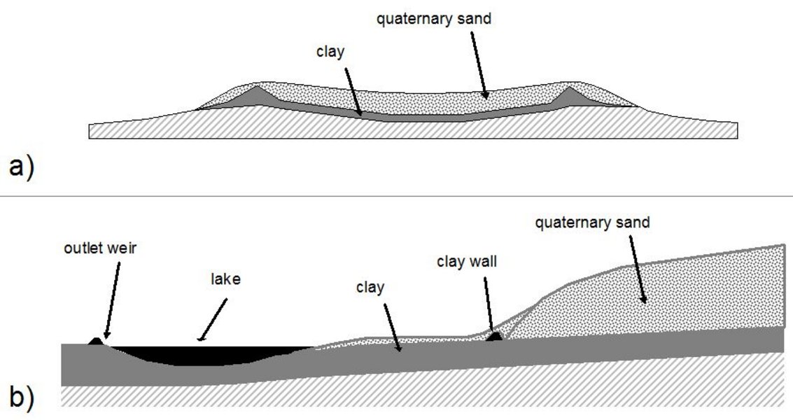 Im Untergrund des unteren Bereichs des Einzugsgebietes wurden senkrecht zur Hangneigung Wälle aus Ton auf der Tonschicht eingebaut, um einerseits Rutschungen des sandigen Substrats zu vermeiden und um andererseits einen zentralen Auslass für das Grundwasser im Sinne einer künstlichen Quelle zu schaffen. Weiterhin wurde im untersten Bereich der Fläche eine Senke geschaffen, die die Entstehung eines kleineren Teiches mit einem Durchmesser von 70 m und einer maximalen Wassertiefe von 3 m erlaubt. Ein Tonwall an der Südseite definiert die untere Grenze des Einzugsgebietes mit einem einzelnen definierten Gebietsauslass.