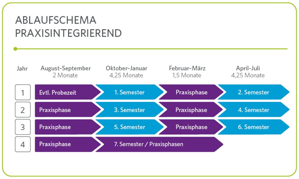 Die beiden Praxismodule Betriebliche Phase 4 und 5 (Bachelor-Praktikum und Bachelor-Arbeit) finden im 7. Semester statt, welches Sie deshalb ausschließlich im Unternehmen verbringen.