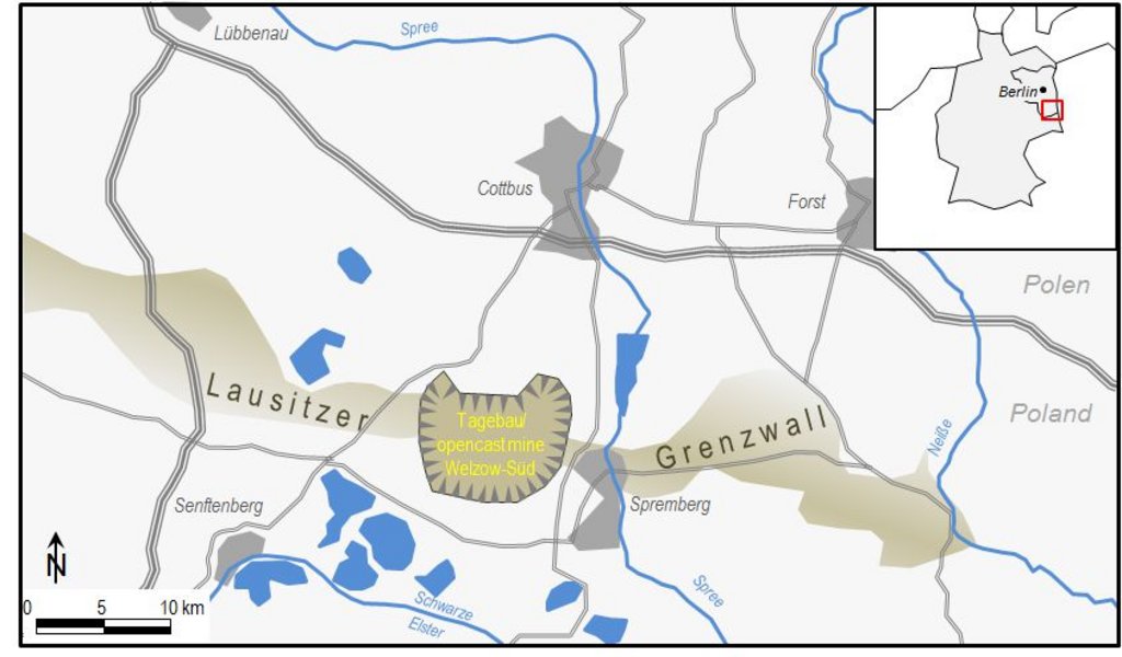 The Hühnerwasser ('Chicken Creek') artificial watershed is located in the lowlands of northeast Germany, in the southerastern parts of the State of Brandenburg with in the lignite opencast mine Welzow-Süd. The name of the investigation site is derived from a former small stream (the Hühnerwasser) destroyed by open-cast mining activities during the 1980s. The site falls within the region of Lower Lusatia, about 150 km southeast of Berlin close to the Polish border. Situated south of Cottbus, the area is predominantly affected by both Pleistocene glacial influences and by more modern anthropogenic disturbance including large-scale open-cast lignite mines.