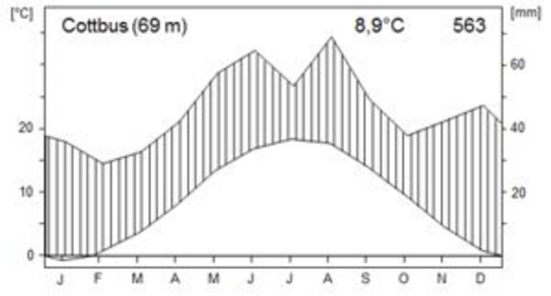 The climate of the region is humid with some sub-continental influence. Minimum temperatures occur in January with an average of -0.8°C; the average maximum temperature of 18.4°C is reached in July (according to 1961-1990 data from Cottbus weather station). Annual total rainfall is comparatively low at only 563 mm, with Lower Lusatia experiencing some of the lowest precipitation levels in the whole of Germany. Due to the predominantly poor sandy soils and low total annual precipitation, mixed oak-pine forests can be regarded as the potential natural vegetation of the Lower Lusatian landscape outside of the glacial valleys. The actual vegetation is currently characterized by large pine forest stands and some agricultural sites, as well as a large proportion of grasslands.
