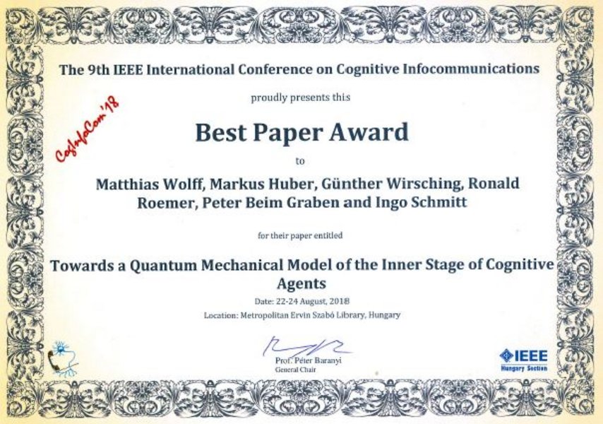 Best Paper Award Matthias Wolff, Markus Huber, Günther Wirsching, Ronald Römer, Peter beim Graben, Ingo Schmitt„Towards a Quantum Mechanical Model of the Inner Stage of Cognitive Agents”9th IEEE International Conference on Cognitive Info Communications (CogInfoCom), Aug. 22-24, 2018