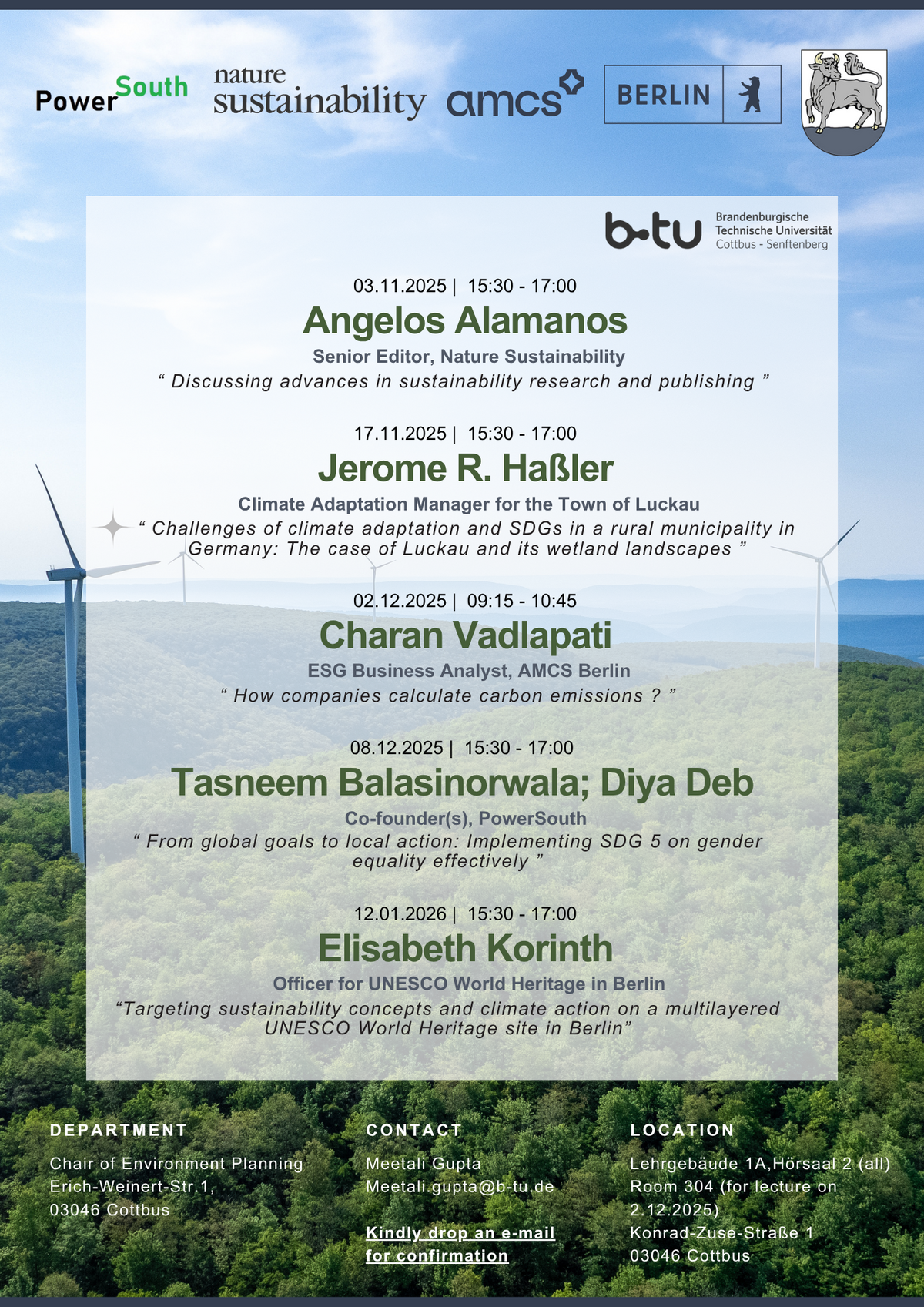 This entails talks focusing on publishing with journals, challenges of climate adaptation and SDGs in rural municipalities in Germany, carbon accounting in companies, implementation of SDG 5, and climate action on a multilayered UNESCO World Heritage site in Berlin.