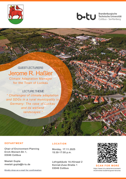 | 2 | Jerome R. Haßler | Luckau Town | Challenges of climate adaptation and SDGs in a rural municipality in Germany: The case of Luckau and its wetland landscapes | 17.11.2025 |