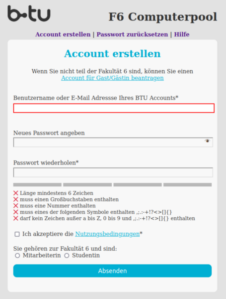 - Go to the page https://gw2.bauwesen.b-tu.de/portal/f6-resetpassword