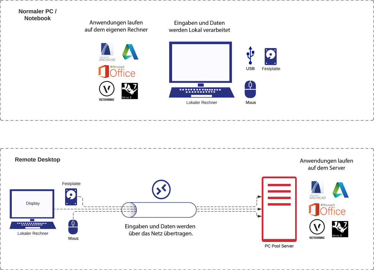"Remote Desktop" is a Microsoft technology for accessing other computers via the network. Only the display and keystrokes are transferred, applications run on the server (see graphic below). A stable network connection should be available, otherwise there will be stuttering and poor image quality. Working in the PC pool or in the BTU network should be fine, on the train between Lübbenau and KW this is probably no fun. You are welcome to share your criticism and experiences with us so that we can see if there is room for improvement. Just write to fakultaet6+pcpool(at)b-tu.de