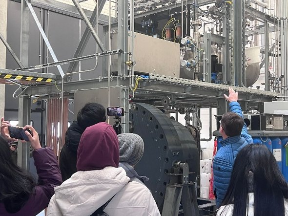 During the tour of the Hydrogen Laboratory, participants gained insights into current research on the production, storage, and use of hydrogen. Researchers provided information regarding experimental setups, safety protocols, and the laboratory's role in future sustainable energy systems. Students were also able to examine equipment, measuring instruments, and test environments up close and to ask questions about ongoing projects.