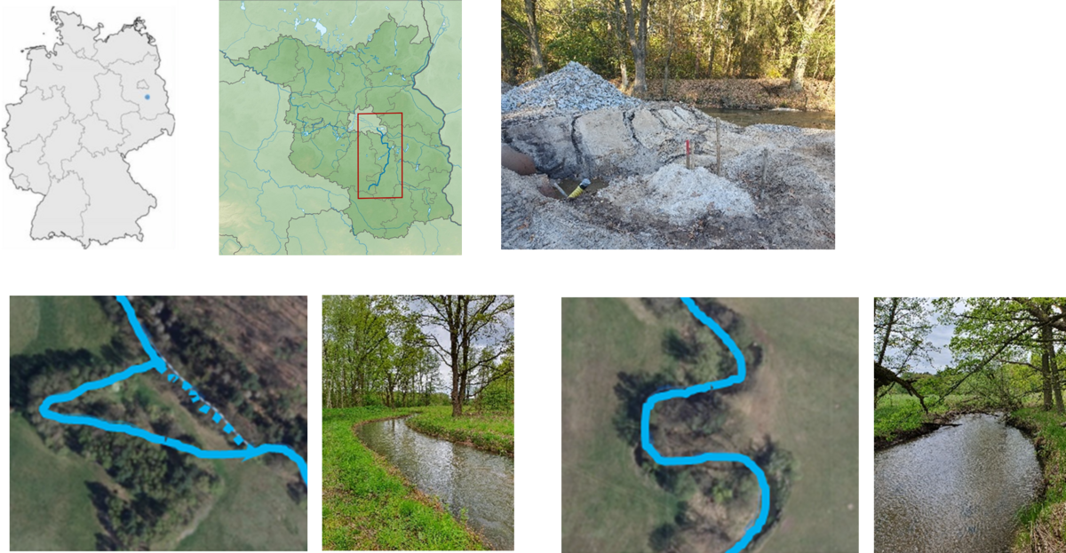 The Dahme is lowland, sandy-bottomed stream (Type 14/15 of the German River typology), with mostly sandy sediments and small areas of larger and finer inorganic sediments. The reaches studied show a dominance of sandy to gravel dominated bed with submerse macrophytes and wooden structures present. The existing (i.e. never straightened) meander reach is located downstream, close to Freidorf (Fig. X below) and is framed by oak trees, that cover and shade the stream completely, in the riparian area and surrounded by extensively farmed grassland beyond. The reconnected meander lies downstream of the Staakmühle in the municipality of Briesen (Halbe), about 500 m upstream of the existing meander. This reach is a reconnected meander with its restoration based on an old meander that was disconnected during the channelization of the river but dug up and reconnected in 2022 as part of the project “LIFE Feuchtwälder“, which is part of the Natura 2000 management plan for Brandenburg (MUGV, 2014). The ‘Horstgraben’, which is an artificial drainage channel, joins the meander at its turning point. Despite the excavation and other restoration efforts, care was taken to preserve the remaining forest and the riparian area frames the reconnected meander with trees in most places while further from the stream grassland is extensively managed.
