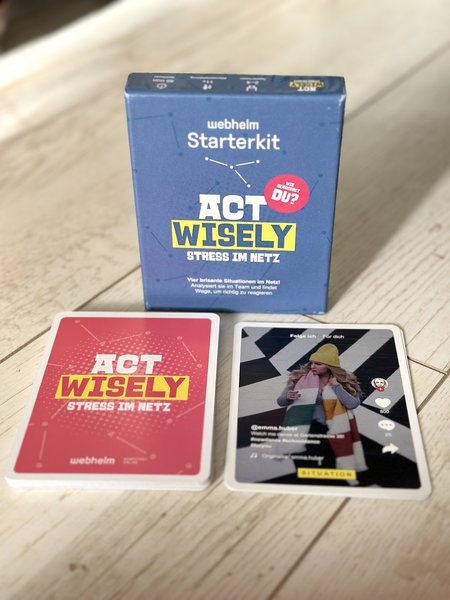 "Act Wisely - Stress on the Net" is a card game specially designed for children and young people that offers an interactive way to deal with the challenges of conflicts and bullying in the digital space. It offers four controversial situations to be analysed as a team. The aim is to work together to find ways to react correctly to these situations.