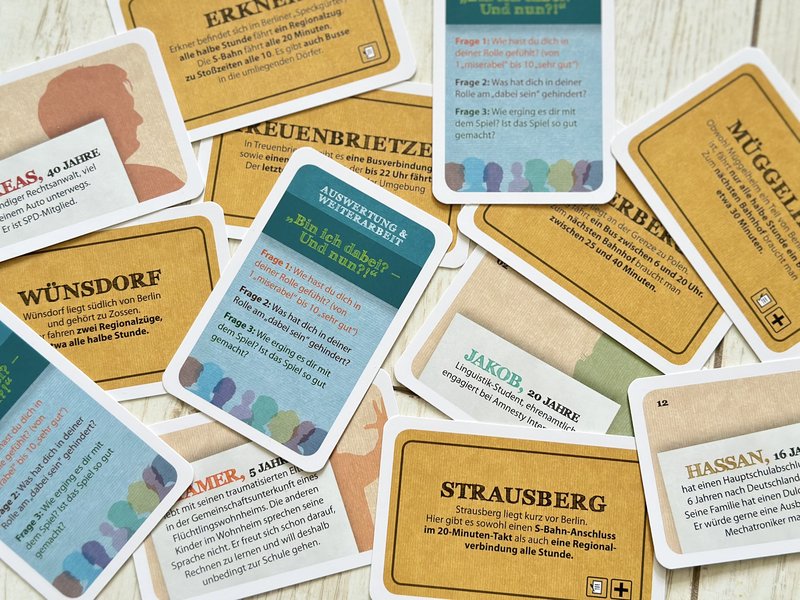 First, the players each take on a new identity. To do this, each player draws a character card and is assigned a place of residence in Berlin or Brandenburg. Then they slip into their new role and answer questions, for example: "Is it easy to get to leisure activities that you enjoy?", "Can you still get home after a party in the neighbouring town after 11 pm?" or "Do you have the opportunity to pursue your dream job?"
