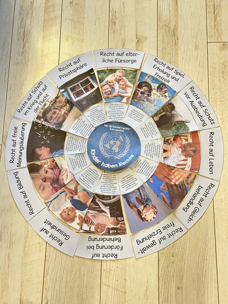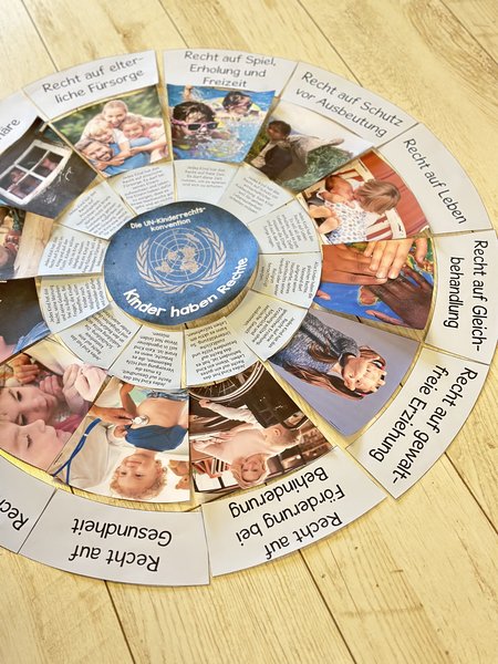 Discover 12 exemplary children's rights in an exciting circle! The interactive laying circle invites children to express their own ideas and thoughts on the topic. The circle can be placed on the floor or attached to the wall (or a blackboard). It is ideal for introducing the topics of children's rights or child protection; it can also be used for parental work if necessary. Each part of the circle represents a different children's right - from the right to education to the right to protection from exploitation. By arranging the respective parts, the children learn the importance of their rights in a simple way.