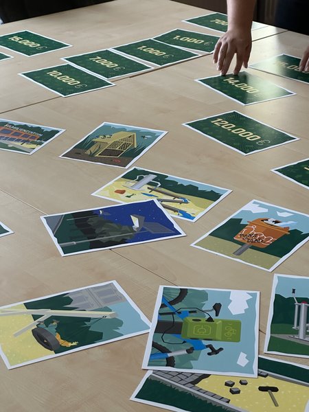 The guessing game contains a total of 30 playing cards; 15 cards show motifs of objects or places in the public space, 15 cards show the cost of the objects. There is also a solution sheet. All 30 cards are shuffled face down. Each player receives one card.