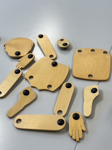 The material consists of 16 body parts - made of natural plywood, sanded and clear lacquered, with connecting plugs for flexible assembly.