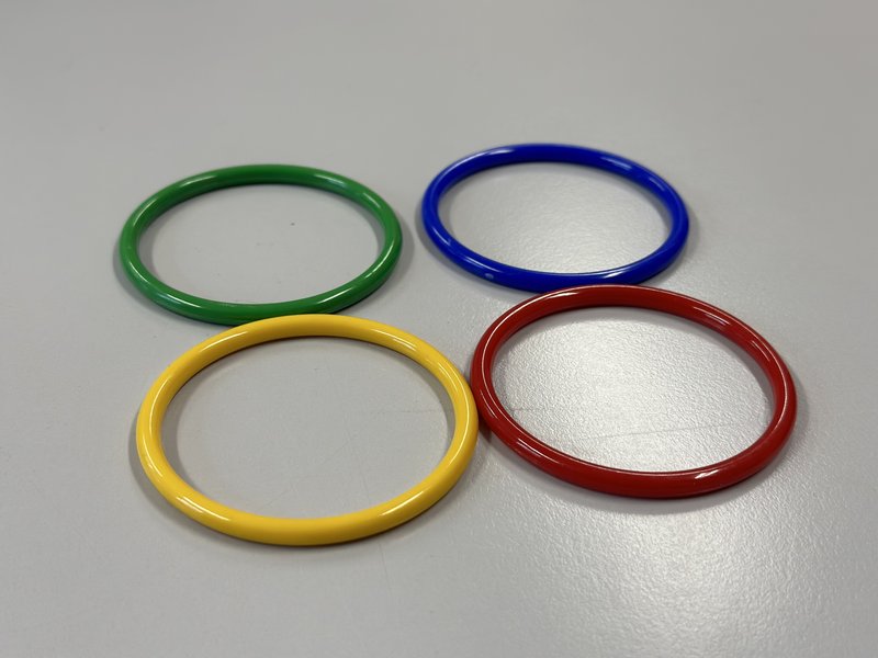 A total of 58 small, differently coloured plastic rings with a diameter of 7 cm can be borrowed from the Laboratory for Didactics and Methods. These rings are available in the colours yellow (14x), red (15x), blue (15x) and green (14x).