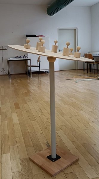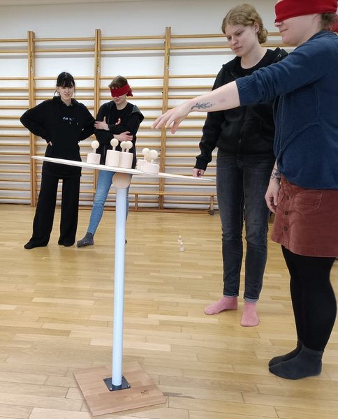 The participants line up in a small circle, in the centre of which is a movable wooden board with randomly distributed figures on a stand. The aim is to constantly balance them - a wobbly affair that requires a great deal of attention. The participants are also divided into teams consisting of 2-3 people, with a blindfolded gripper and a spokesperson, i.e. one person is blindfolded. They have to 'grab' the figures on the wooden board and move them, with constant verbal guidance from the speaker. Touching by the speaker is not permitted.