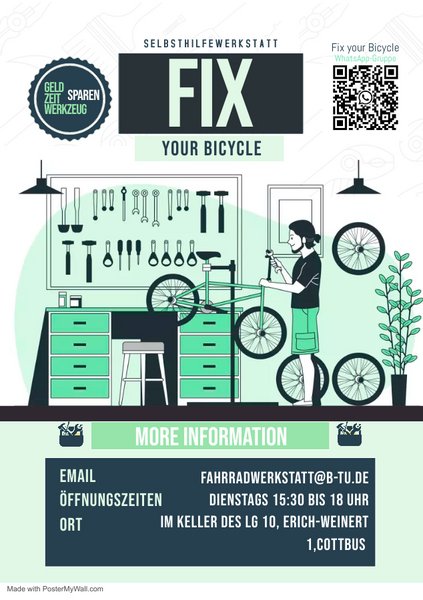 The BTU DIY Bicycle Workshop has opened weekly again since January 2023! In the basement of LG10 every Tuesday from 15:30 - 18:00 students, faculty and external people can repair their bikes on their own or with the help of the people on site.