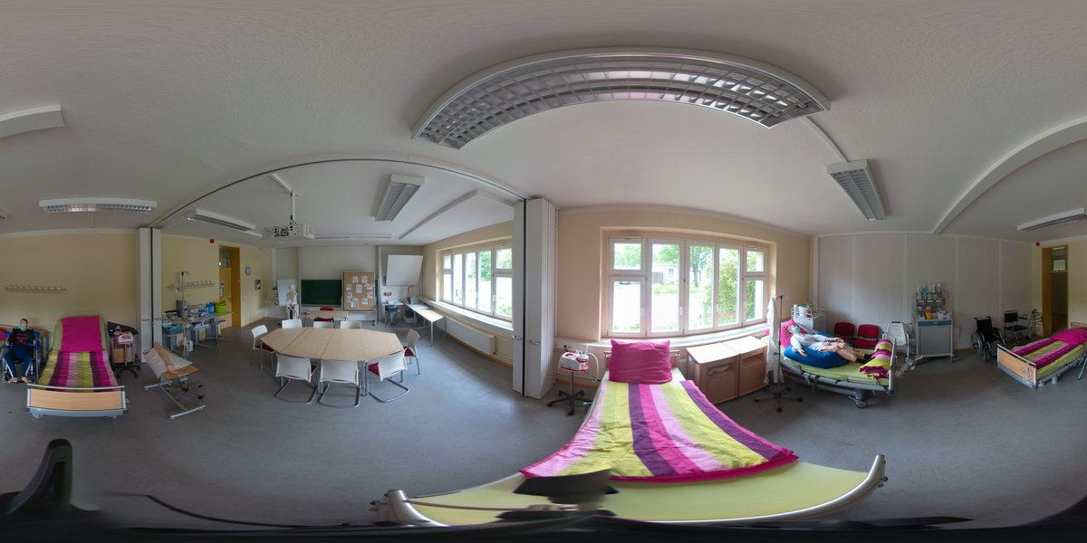 The Skills Lab is a stationary area with a patient room and preparation room. Here, a variety of care situations in everyday hospital and nursing care can be simulated. Specially equipped nursing dolls, a wide range of nursing materials and medical devices enable trainees to practise personal hygiene, assistance with eating and elimination, injections, changing dressings, positioning and transfers, among other things.
