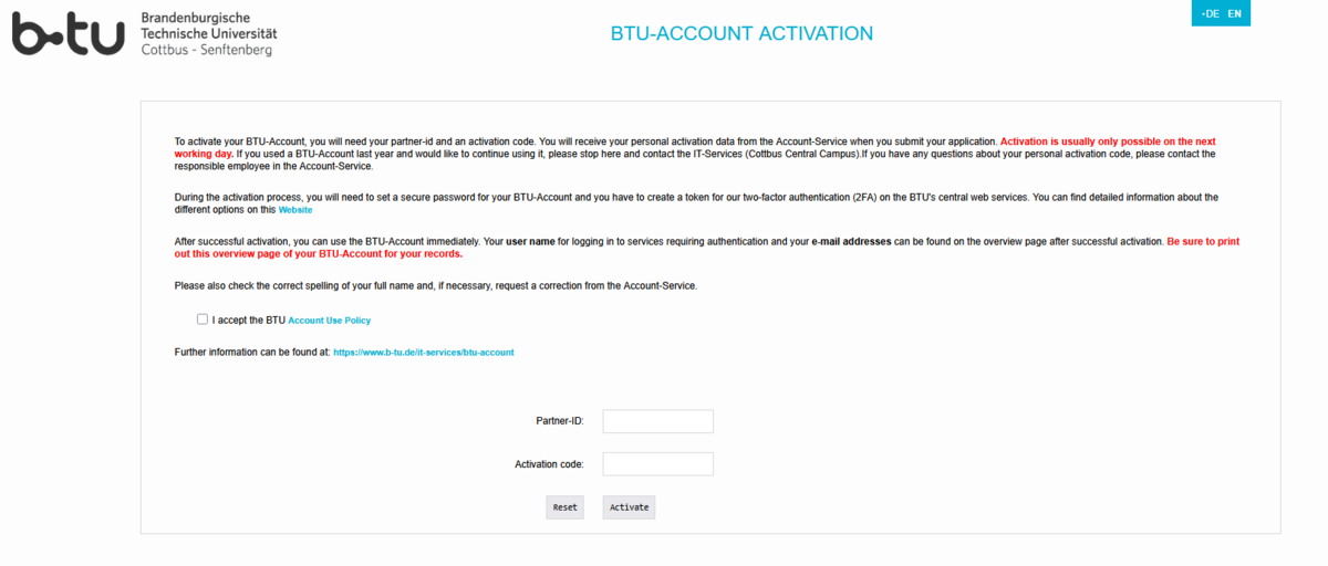 Students activate their BTU account via the web portal: https://www.b-tu.de/account/s-activate
