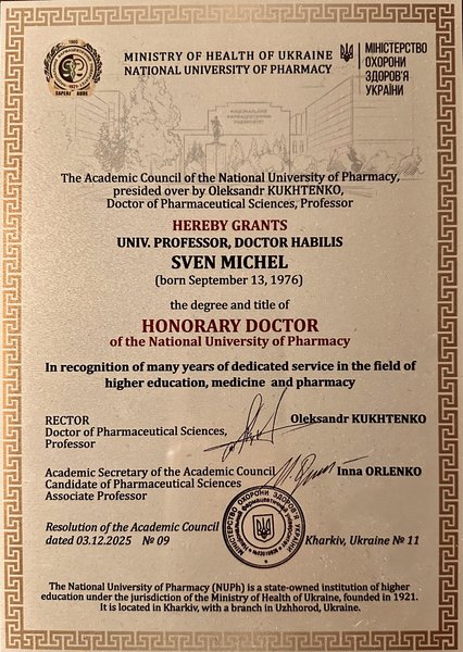 Professor Michel was awarded an honorary doctorate from NUPh in special recognition ofhismany years of work in the field of international educational cooperation, healthcare training and the promotion of partnerships, in particular with countries in the Arab world. The Honorary Chevron of Ukraine has been awarded since 2022 as a sign of trust, appreciation and gratitude. The award was presented by the Rector of NUPh Prof. Dr Oleksandr Kukhtenko in the presence of the Deputy Ukrainian Ambassador, Embassy Counsellor Natalia Chernopaschenko, at the international peace summit on the Russian invasion of Ukraine, which took place in Berlin in mid-December.