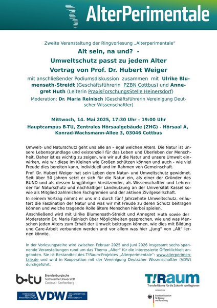 Between February 2025 and June 2026, the lecture series will offer a total of six exciting events on the topic of ageing for the interested public. It is part of the T!Raum project "Alterperimentale" and is being organised in cooperation with the Association of German Scientists (VDW).