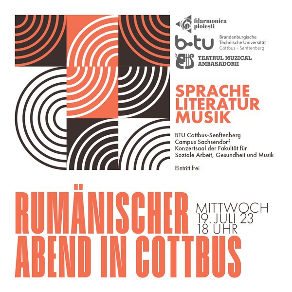 The event is being held in collaboration with the "Paul Constantinescu" Philharmonic Orchestra from Ploiești, Romania, and marks the second joint event organized by the integrated German-Romanian Social Work double degree programme (B.A.) at BTU and the Romanian Philharmonic Orchestra. On June 10, 2022, artists from the Philharmonic opened the online guest lecture Scurtă istorie a filmului românesc/ A Short History of the Romanian Moving Pictures by Romanian film critic Irina-Margareta Nistor, which took place with the kind support of the Embassy of Romania in the Federal Republic of Germany and the Romanian Cultural Institute Berlin, in cooperation with the Cottbus Film Festival, under the motto "30 Years of German-Romanian Partnership and Friendship in Europe": https://www.b-tu.de/news/artikel/21293-default-d22b93e0db