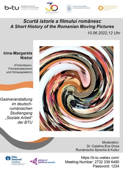 The integrated German-Romanian degree program "Social Work" with double degree at the Brandenburg University of Technology Cottbus-Senftenberg invites you to the video conference Scurtă istorie a filmului românesc/ A Short History of the Romanian Moving Pictures by the Romanian film critic, film interpreter and actress Irina-Margareta Nistor on 10 June 2022 at 12 noon.