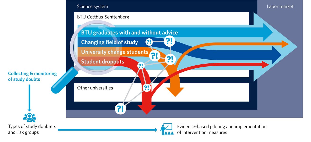 The proportion of students who drop out of their degree programme without successfully completing it has long been considerable throughout Germany. Even in the university context, dropout rates in Bachelor's degree programmes often reach an average of around one third of the first-year students who originally started their studies. Even taking into account conceptual vagueness, it can therefore be assumed that this is not only an individually but also institutionally significant problem area. However, despite countless studies on drop-outs and drop-outs with countless interventions derived from these studies, not least counselling services, the situation outlined here in brief has not improved. This is why RISKEB is trying to break new ground and is using the concept of study doubt. On the one hand, it addresses an early phase in the consideration and decision-making process of a possible change of subject, change of study location or dropping out of studies; on the other hand, this concept brings other dimensions into focus, which should then also be taken up in the design of counselling services.