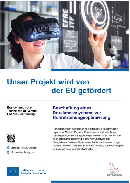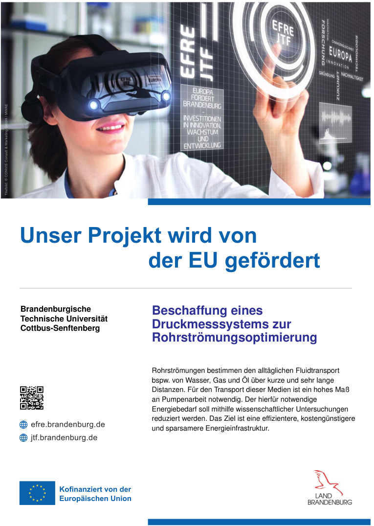 Die Experimente werden über einen großen Bereich von Reynolds Zahlen von 6x104 ≤ Reb ≤ 1x106 (bezogen auf den Durchmesser (D) und die mittlere Geschwindigkeit (Ub)) und kleinen Mach-Zahlen (Ma < 0,23) an der Cottbus Large Pipe Testeinrichtung (CoLa-Pipe) durchgeführt, die extra zu diesem Zweck aus eigenen Mitteln aufgebaut wurde. Die turbulenten Strömungseigenschaften werden durch Hitzdraht-Anemometrie (HDA) und Particle-Image-Velocimetrie (PIV-) Verfahren gemessen und charakterisiert.