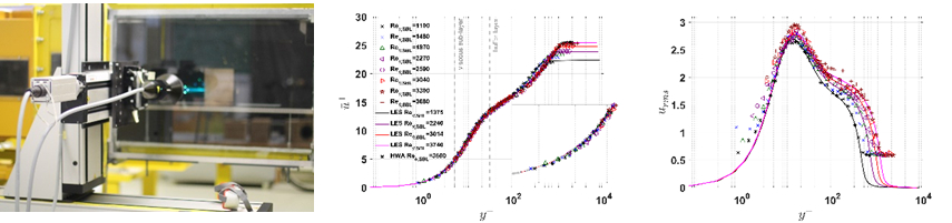 Figure-1: (Left) Near-wall measurement at LAS wind tunnel using laser Doppler anemometry, (middle) law-of-wall presentation of TBL data using direct measurement of the wall shear stress and (right) streamwise velocity fluctuations (Hasanuzzaman (2021), Hasanuzzaman et al. (2022))