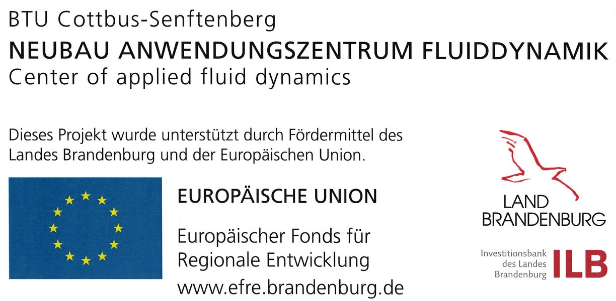 Ziel des Ende 2017 genehmigten EFRE-Vorhabens in Höhe von ca. 5 Mio. € war der Neubau des "Anwendungszentrums Fluiddynamik" der Brandenburgischen Technischen Universität Cottbus-Senftenberg (BTU) auf dem Zentralcampus in Cottbus. Das neue Gebäude mit Gesamtbaukosten von ca. 7,6 Mio. € soll die Anzahl der Projekte, insbesondere die Kooperationsvorhaben im Bereich der Energietechnik mit der regionalen Industrie und damit den Technologietransfer maßgeblich erhöhen. Neben neuen Büros für die bisher in verschiedenen Gebäuden verteilten Mitarbeiter der Lehrstühle LAS, LTA und LNSG sowie dem CFTM² und der neu geschaffenen Professur für Bildgebende Messverfahren (eine gemeinsame Berufung der BTU mit dem DLR) ist auch Platz für 7 weitere Labore geschaffen worden:
