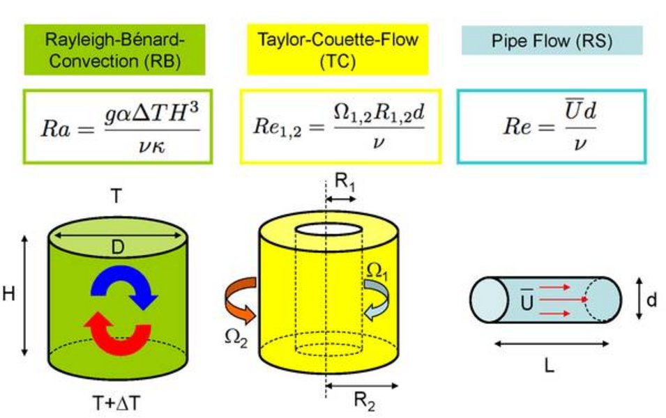 Aufbauend auf Beobachtungen und Einsichten in Grenzschichtdynamiken in den letzten Jahren sollen daher in unserer Forschergruppe sowohl die globalen Skalierungseigenschaften des turbulenten Transportes wie auch die lokalen dynamischen Prozesse in der Nähe fester Wände untersucht und in Zusammenhang gebracht werden. Einen besonderen Erkenntnisfortschritt erwarten wir dabei durch vergleichende Untersuchungen von drei fundamentalen Strömungen, die bisher meist getrennt betrachtet wurden: thermische Konvektion in einer von unten geheizten Zelle (Rayleigh-Bénard), Scherturbulenz zwischen zwei konzentrischen, sich drehenden Zylindern (Taylor-Couette) und druckgetriebene Turbulenz in einer Rohrströmung.