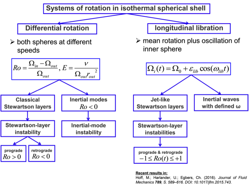 All diese Hintergrundrotationen haben einen großen Einfluss auf das Strömungsverhalten im Kugelspalt. Je nachdem, welcher Rotationszustand vorliegt, können unterschiedliche Phänomene isoliert untersucht werden, z.B. Trägheitswellen, Stewartsonschichten und diverse Instabilitäten, um nur einige zu nennen.