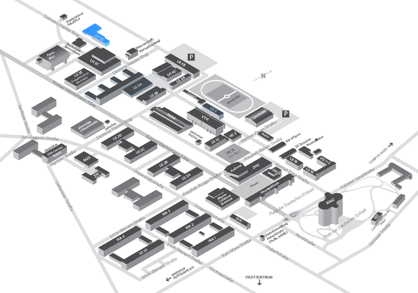 - Richtung Stadtzentrum, eine Ausschilderung zur Universität ist auf den meisten Hauptverkehrsstraßen vorhanden