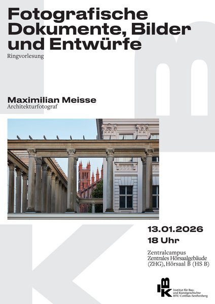 hiermit laden wir zur zweiten Veranstaltung der Ringvorlesung 2025/26 des Instituts Bau- und Kunstgeschichte „Wofür stehen wir?“ ein. Vortragender ist der Berliner Architekturfotograf Maximilian Meisse, der seine Arbeit wie folgt beschreibt: „Aufgabe und Bedeutung der Fotografie werden von drei unterschiedlichen Ebenen des Bildermachens bestimmt: Von einer dokumentarischen, einer bildnerischen und einer entwurflichen Ebene. Ihre Anwendung beeinflußt die Qualität des fotografischen Bildes.“
